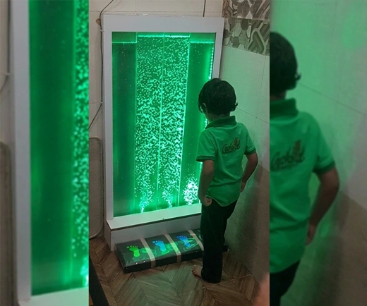Induces Calmness and Relaxation The sensory calming bubble wall creates a gentle, visually soothing environment that helps children feel relaxed, focused, and emotionally balanced. Relieves Anxiety among Children The slow movement of bubbles combined with soft, changing colors provides a calming visual anchor, supporting children who may experience sensory overload, anxiety, or difficulty settling into learning activities. This makes it especially beneficial for special needs environments as well as Montessori classrooms that value calm, self-directed engagement. Encourages Interactive Play Designed to encourage quiet interaction, the bubble wall supports relaxation, visual tracking, and moments of mindfulness, helping children regulate their emotions and attention. With simple, durable controls, children can safely change colors and lighting effects themselves, fostering independence and a sense of control.